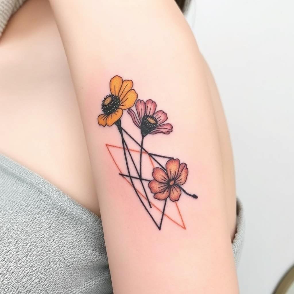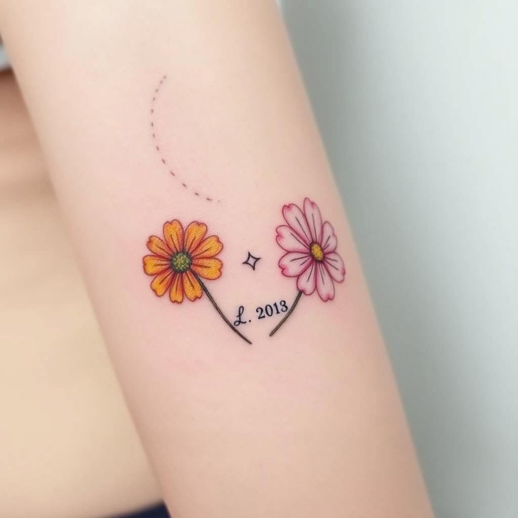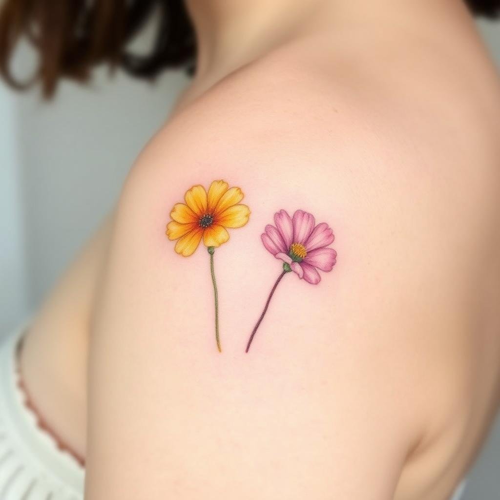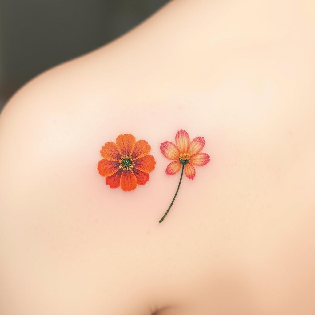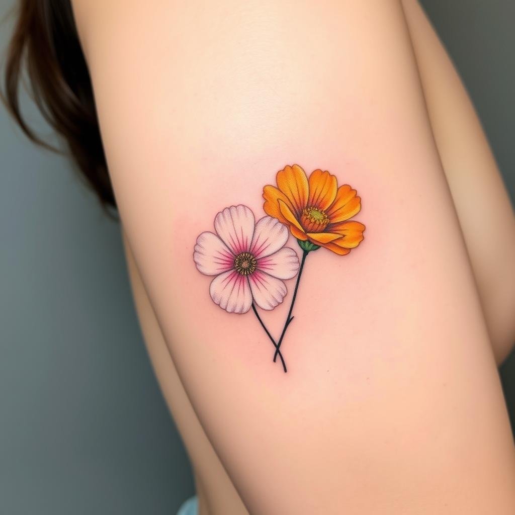 Consider what marigolds and cosmos mean together. They show different sides of you. This makes your tattoo special and meaningful, celebrating your unique qualities.