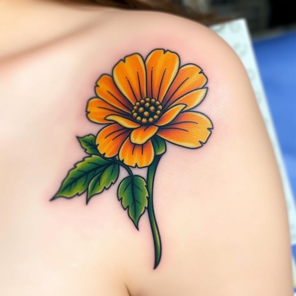 Traditional tattoos give your october birth flower design a classic look. They use bold black lines and bright colors. This makes your marigolds and cosmos stand out.