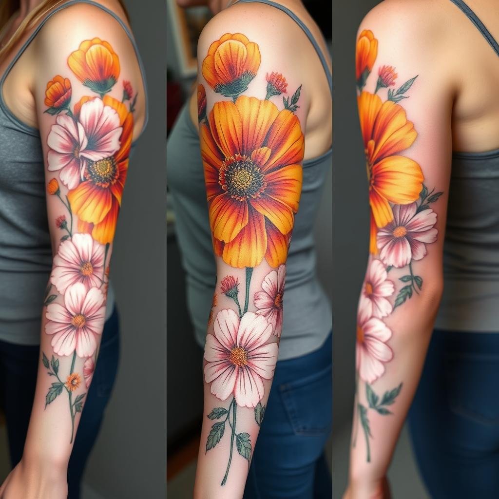 An october birth flower tattoo sleeve lets you create detailed designs. You can mix marigold’s bright colors with cosmos’s soft petals. This makes a story on your arm.