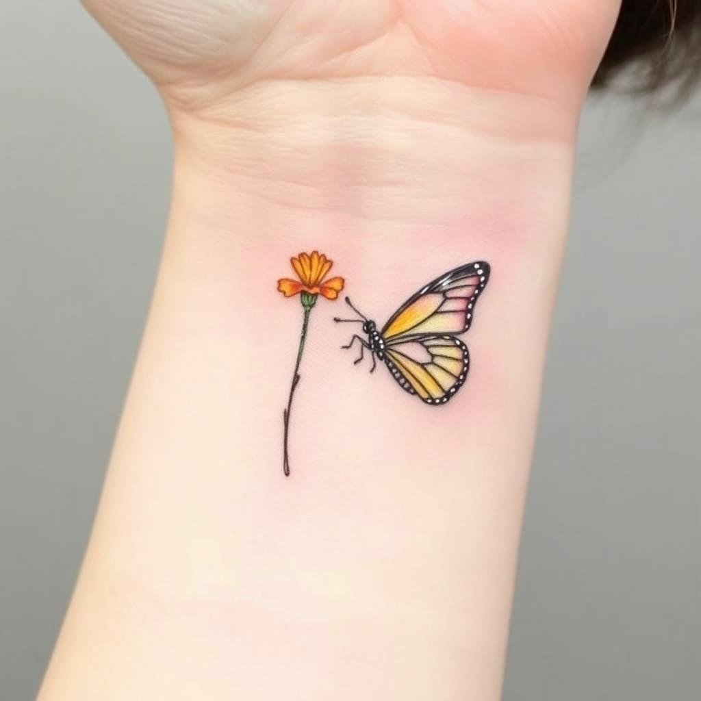 A butterfly makes an october birth flower tattoo special. Its wings and the bright marigolds show change and beauty. These tattoos let you tell your story in a beautiful way.